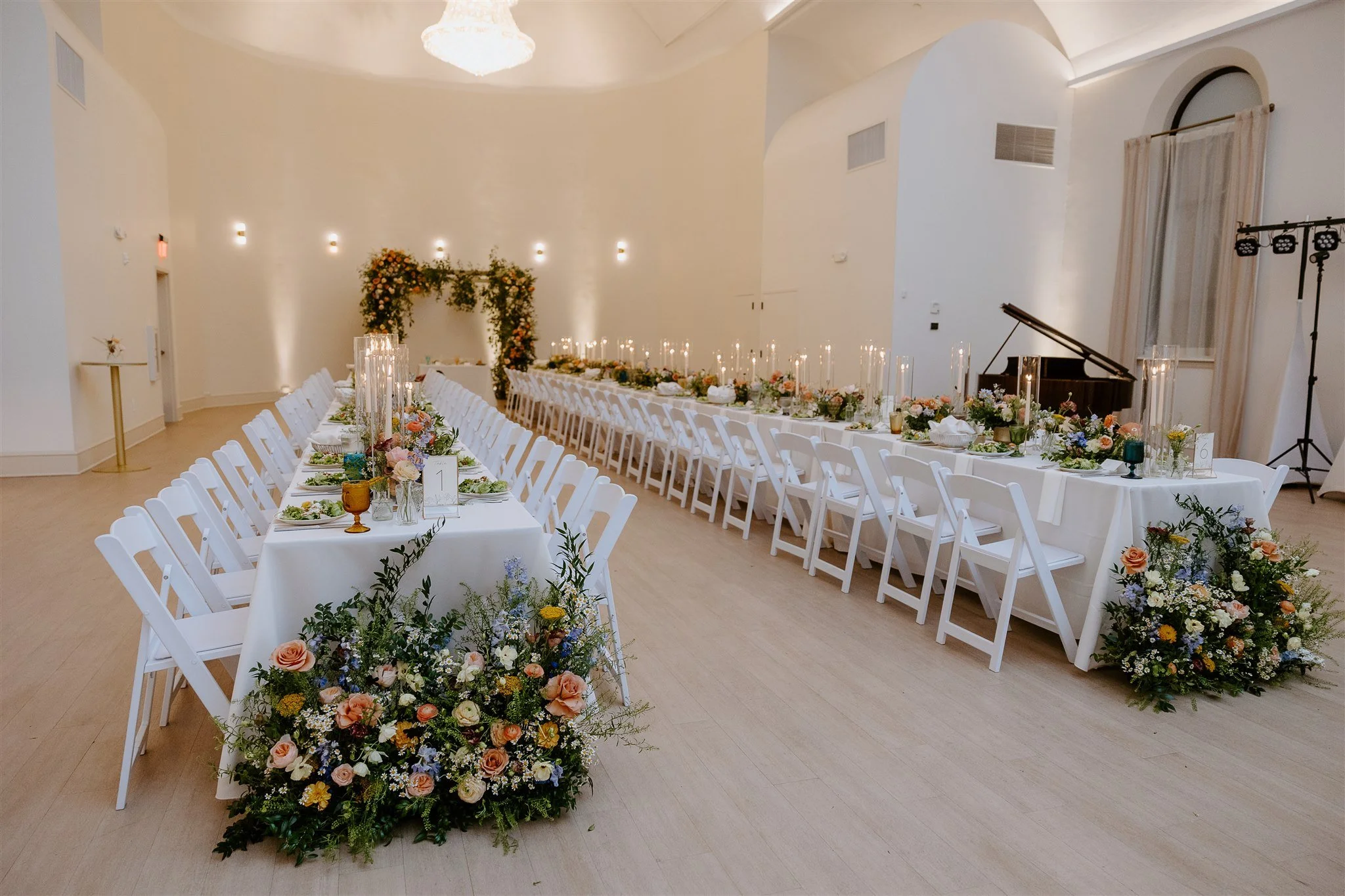 Our ballroom’s grand staircase leads to a balcony that highlights the iconic rose window and sits opposite the room’s stunning 8’ Swarovski crystal chandelier. The 29’ barrel-vaulted ceiling provides excellent acoustics and dimmable wash lighting that accent its historic structure and original stained glass. The 27' quartz bar, open floor plan & neutral hues allow for creative arrangements of seating, dance floors & décor, ensuring every detail aligns with your vision.