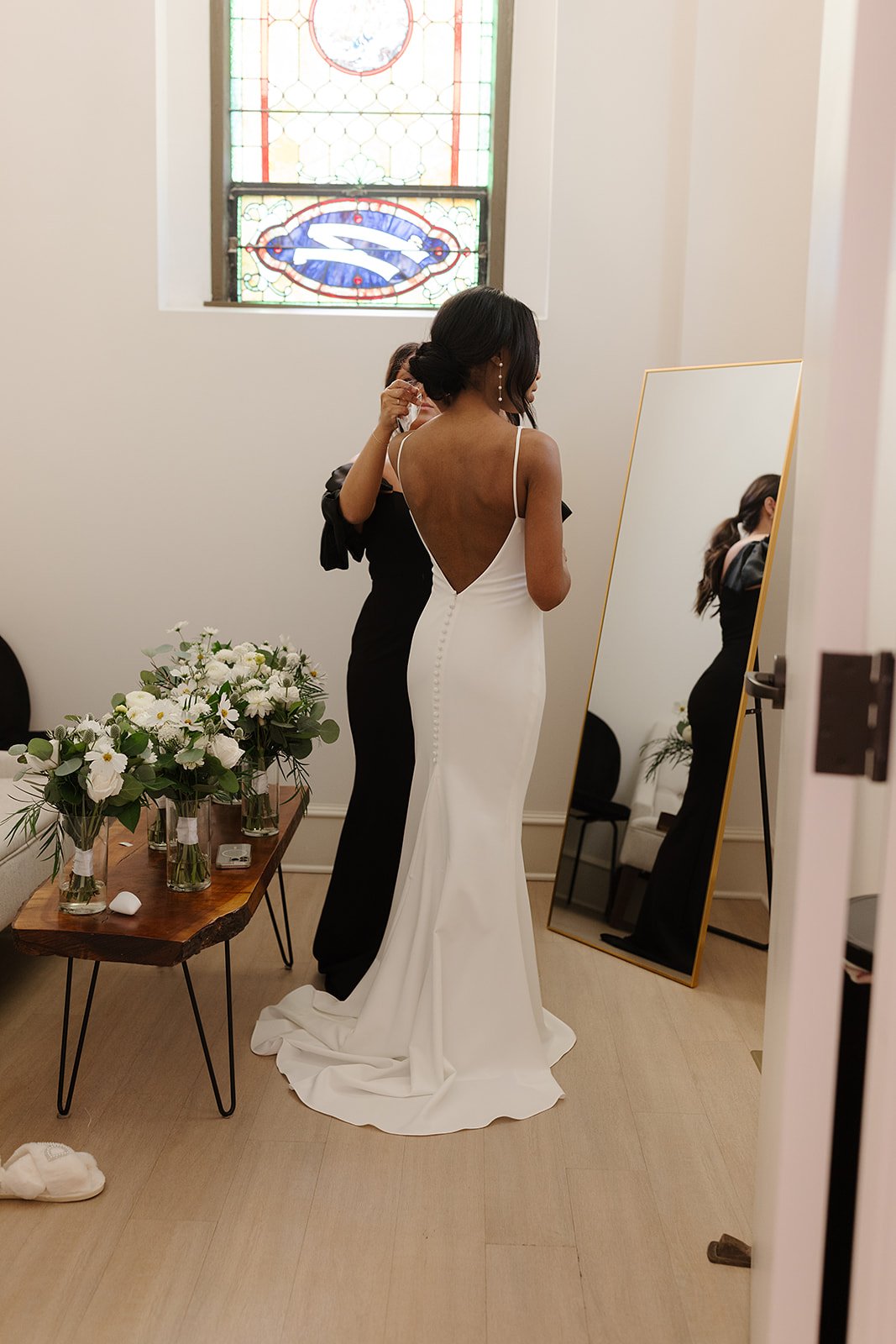 2 distinct getting ready spaces for both wedding parties, including 2 dressing rooms with soft seating and mirrors